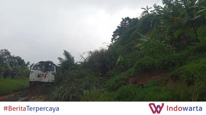 Kereta Ciremai dengan rute Semarang Tawang menuju Bandung terjebak akibat tanah longsor di petak Jalan Maswati-Sasaksaat, Kabupaten Bandung Barat pada Rabu (1/4/2026). Longsor tersebut menyebabkan jalur kereta api di KM 142+8/9 terputus dan memaksa perjalanan kereta dihentikan sementara.