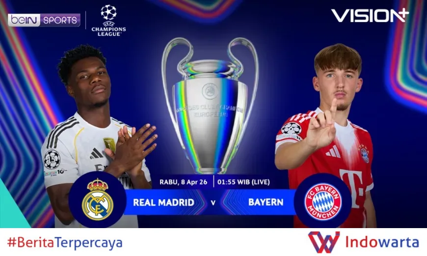 Bagi Anda yang mencari link live streaming Real Madrid vs Bayern Munich, pertandingan ini dapat disaksikan secara langsung melalui channel beIN Sports 1 dan platform VISION+. Laga ini dijadwalkan berlangsung pada Rabu, 18 Maret 2026 pukul 02.55 WIB.