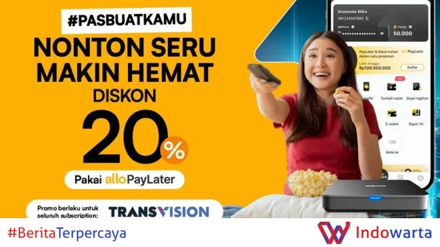 Menikmati tontonan berkualitas di Transvision kini semakin hemat berkat promo menarik dari Allo Paylater. Mulai tanggal 6 April hingga 31 Desember 2026, pelanggan Transvision bisa mendapatkan diskon 20% saat melakukan pembayaran menggunakan Allo Paylater. Tidak hanya itu, pengguna baru Allo Paylater juga berkesempatan memperoleh cashback 5% sebagai bonus tambahan.