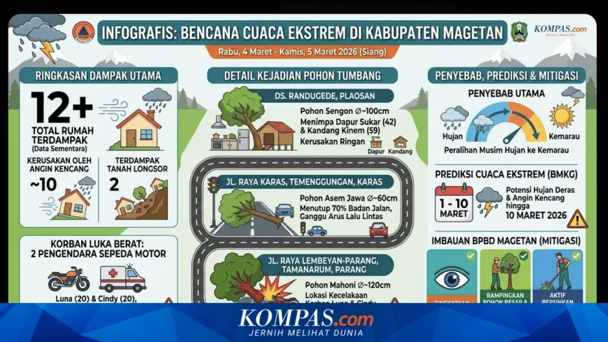 Hujan deras yang disertai angin kencang mengguyur Kabupaten Magetan sejak Rabu (4/3/2026) hingga Kamis (5/3/2026) siang, menyebabkan sejumlah bencana alam seperti puluhan pohon tumbang dan tanah longsor di beberapa wilayah. Fenomena ini memicu kerusakan rumah warga serta kecelakaan yang menimpa dua pengendara sepeda motor.