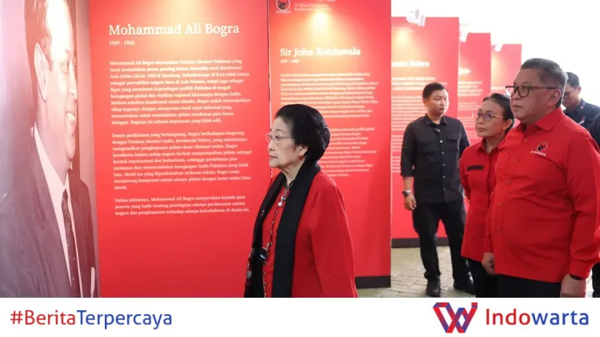 Sesampainya di lokasi, Megawati langsung melakukan peninjauan ke lorong masuk Sekolah Partai yang dihiasi dengan berbagai catatan dan dokumentasi sejarah tokoh-tokoh penting dari Konferensi Asia-Afrika. Ia tampak serius membaca setiap dokumentasi yang dipajang, menandakan kedalaman apresiasi dan pemahamannya terhadap peristiwa bersejarah tersebut.
