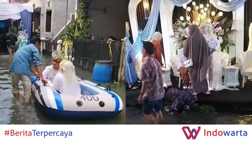 Suasana resepsi pernikahan yang digelar di tengah banjir baru-baru ini viral di media sosial. Kejadian unik ini terjadi di wilayah Bojongsoang, Kabupaten Bandung, yang sedang mengalami banjir parah. Momen saat pasangan pengantin diantar menggunakan perahu karet menjadi sorotan netizen dan mengundang beragam komentar.