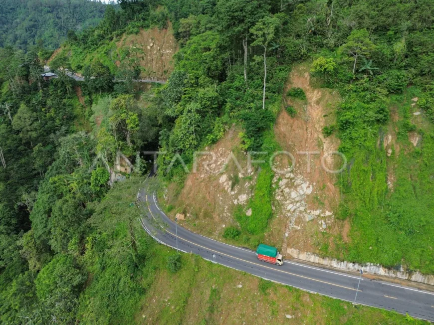 Foto udara yang diambil pada Sabtu, 14 Maret 2026, memperlihatkan kondisi kawasan rawan longsor di jalur tersebut, menjadi bukti visual penting untuk kesiapsiagaan dan perencanaan mitigasi BBPJN.