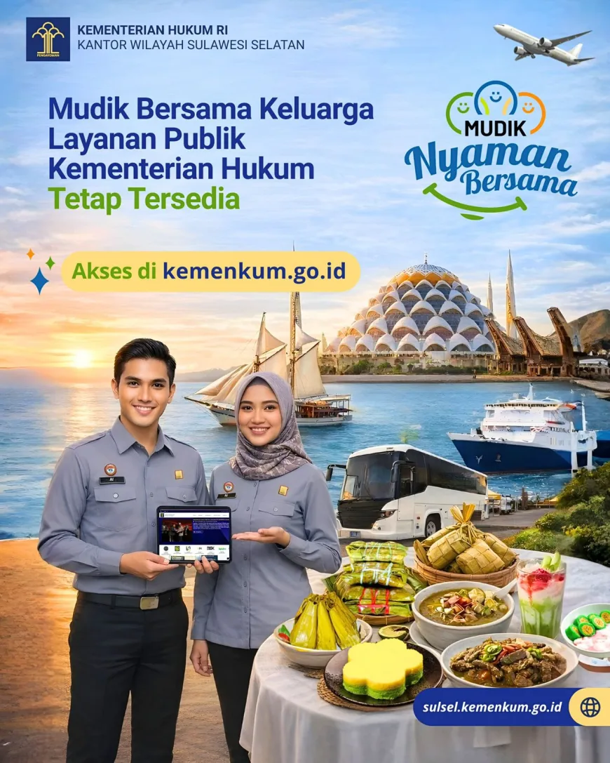 Selama periode mudik, layanan hukum tetap tersedia bagi masyarakat. Hal ini ditegaskan oleh Kepala Kantor Wilayah Kementerian Hukum Sulawesi Selatan (Kakanwil Kemenkumham Sulsel), Andi Basmal, yang mengimbau masyarakat untuk memanfaatkan layanan digital yang telah disediakan oleh Kementerian Hukum dan Hak Asasi Manusia Republik Indonesia.