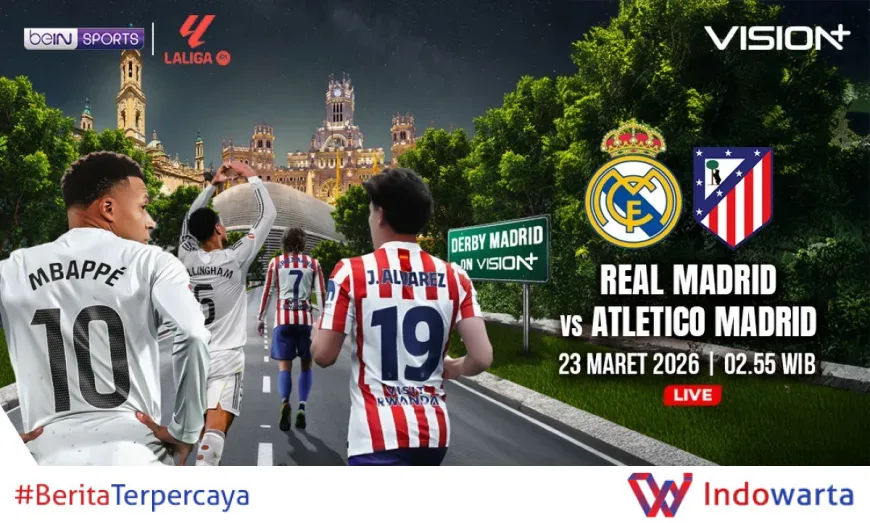 Real Madrid akan menghadapi Atletico Madrid dalam pertandingan big match pekan ke-28 LaLiga 2025-2026. Duel seru yang dikenal dengan sebutan El Derbi Madrileno ini dijadwalkan berlangsung pada Senin, 23 Maret 2026 pukul 02.55 WIB dan dapat disaksikan secara streaming melalui Vision+ di beIN Sports 1.