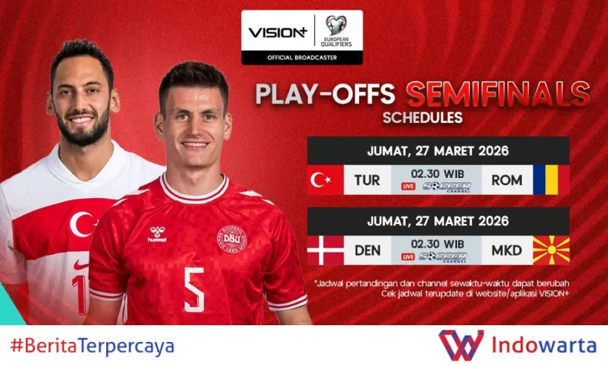 Berikut adalah jadwal lengkap pertandingan playoff zona Eropa yang dapat Anda tonton langsung di Vision+: