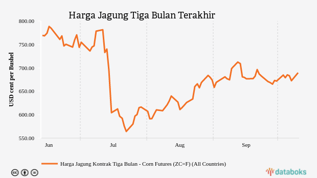 Harga jagung rata-rata bulan Oktober tercatat USD682,25 per bushel naik 0,27 persen dibandingkan bulan sebelumnya yang berada di harga USD680,44 per bushel.