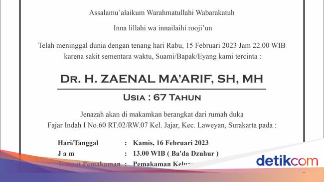 Mantan Wakil Ketua DPR Zaenal Ma'arif dikabarkan meninggal dunia. Kabar dukacita ini dibenarkan Sekjen DPP Partai Persatuan Pembangunan (DPP PPP) Arwani Thomafi