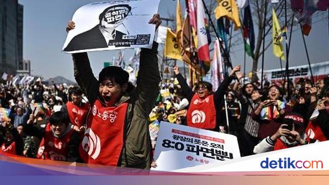 Pendemo bersorak-sorai usai MK Korsel mengesahkan pemakzulan Presiden Korsel Yoon Suk Yeol. Sementara, para pendukung Yoon menangis saat mendengar putusan itu.