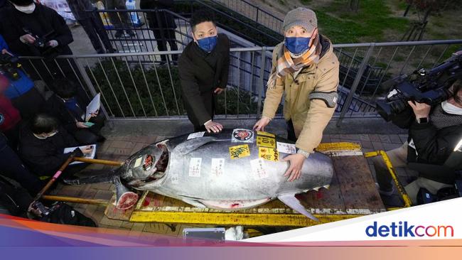 Seekor tuna sitip biru laku keras dalam lelang di pasar ikan Toyosu, Tokyo. Harganya fantastis mencapai Rp 4,24 miliar lho.