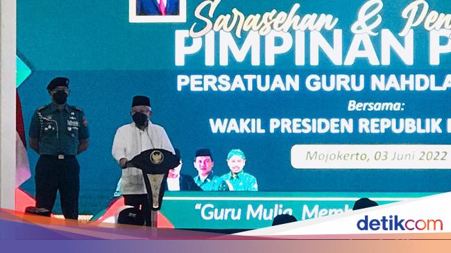 Wakil Presiden Ma'ruf Amin menghadiri pengukuhan pimpinan pusat Persatuan Guru NU di Mojokerto. Wapres berpesan agar guru mampu mengantisipasi disinformasi.
