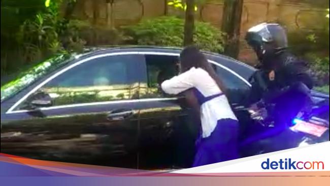 Seorang wanita menerobos iring-iringan lalu memasukkan tangan ke dalam mobil Presiden Joko Widodo di Bali. Wanita itu juga sempat menarik tangan Jokowi.