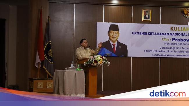 Prabowo merespons pertanyaan terkait Pilpres 2024 usai memberikan kuliah umum di Universitas Brawijaya. Prabowo menjawab masa pilpres masih lama.