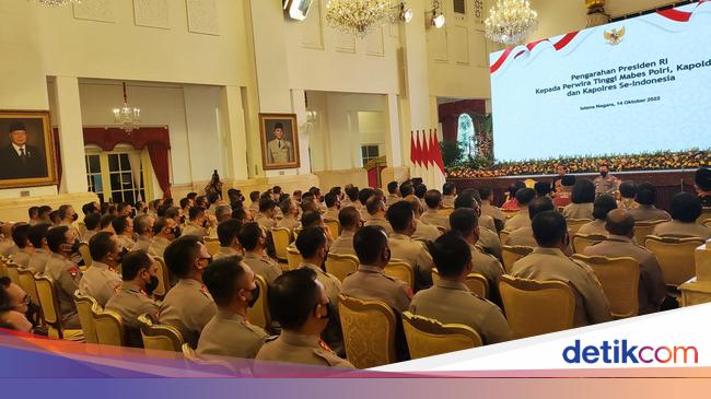 Rombongan pejabat polisi menghadap Presiden Jokowi di Istana Kepresidenan tanpa tongkat dan topi polisi. Kenapa?